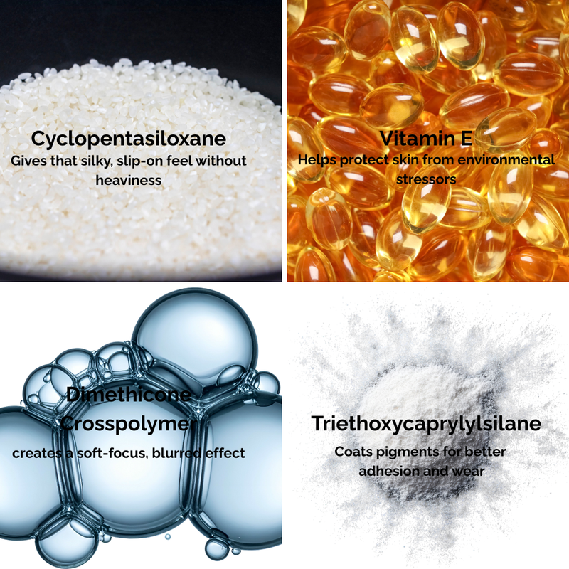 💡Water, Cyclopentasiloxane, Dimethicone/ Vinyl Dimethicone Crosspolymer, Isododecane, Trimethylsiloxysilicate, Cyclohexasiloxane, Methylpropanediol, PEG-10 Dimethicone,silica, Cetyl PEG/ PPG-10/1 Dimethicone, Disteardimonium Hectorite, Polyglyceryl-3 Diisostearate,